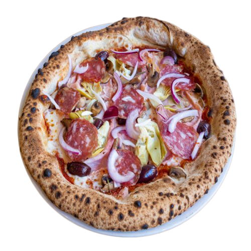 Tomatensaus, fior di latte, prosciutto cotto, salami felino, ui, gegrilde artisjok, kalamata olijven en champignons