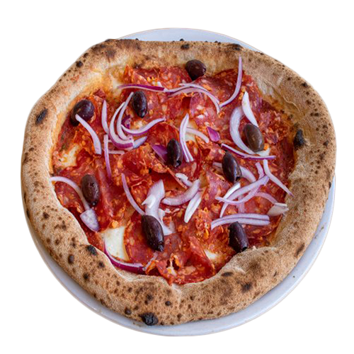 Tomatensaus, fior di latte, ui, salami ventricina, nduja en kalamata olijven